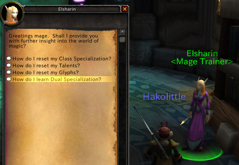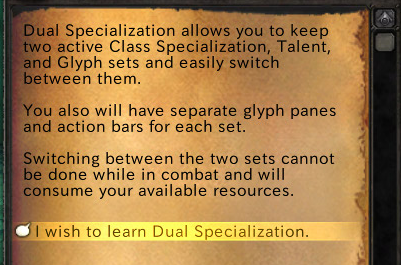 DualSpecについて説明してくれます。Specごと個別にTalentやGlyphを管理することができます。